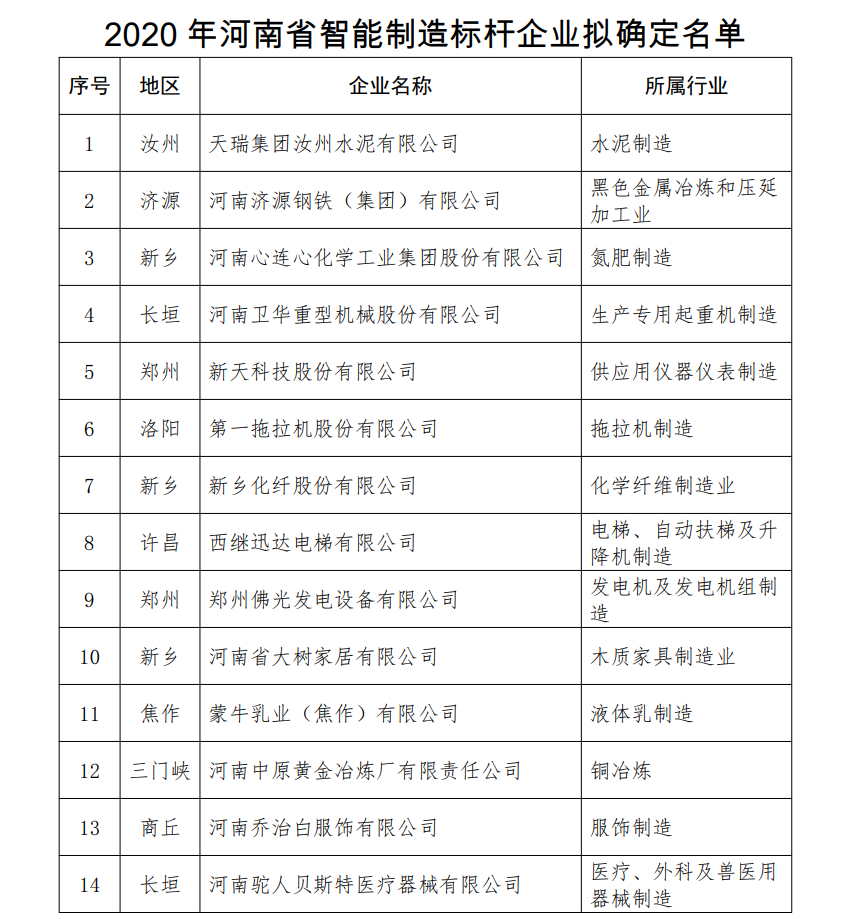 根据《河南省工业和信息化厅办公室关于开展2020年智能制造标杆企业遴选工作的通知》(豫工信办产融〔2020〕221号),经各地工业和信息化主管部门推荐,省工业和信息化厅组织专家进行材料评审和现场核查,拟确定天瑞集团汝州水泥有限公司等14家企业为2020年河南省智能制造标杆企业,现予公示,接受社会监督。如有异议,请以书面形式向省工业和信息化厅反映。